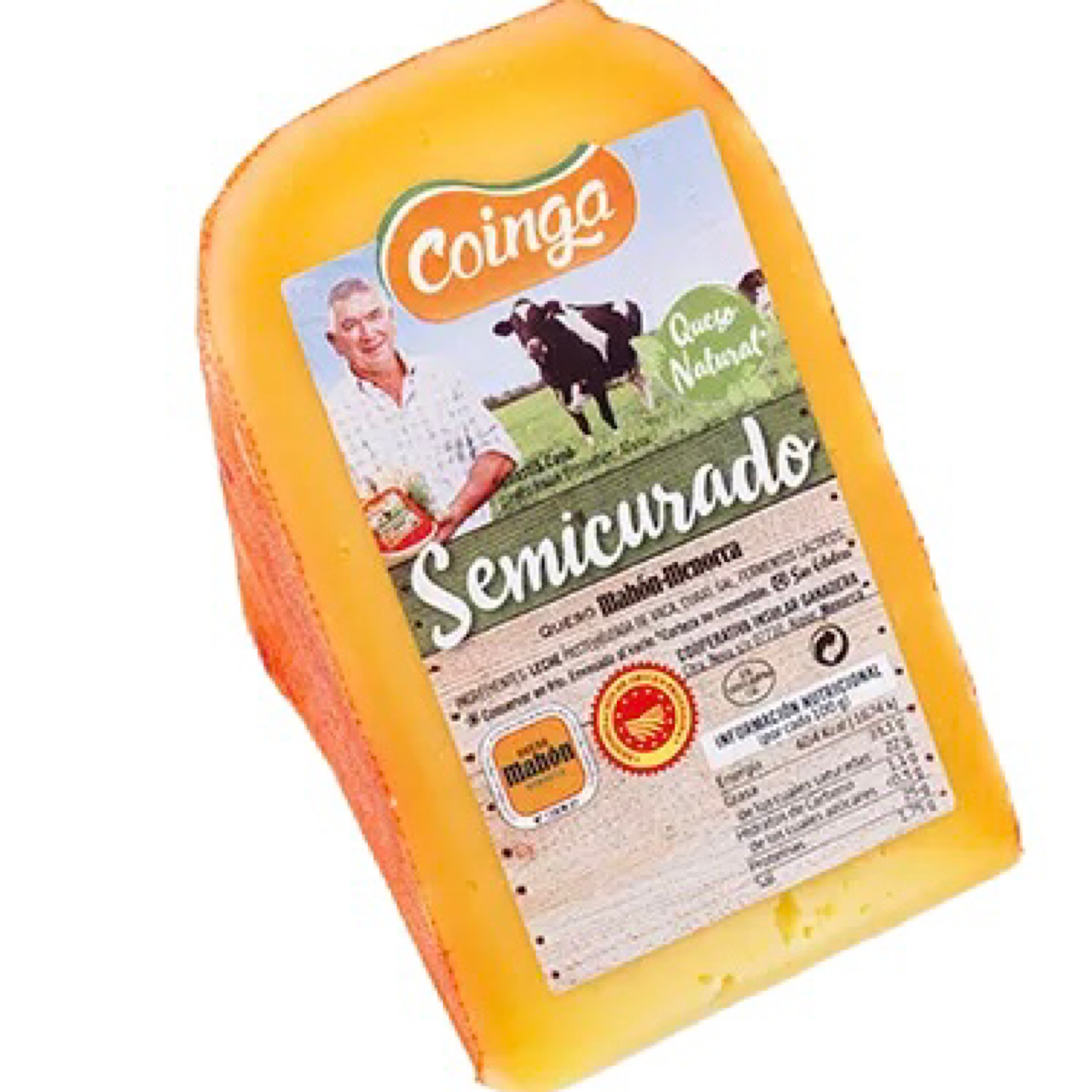 Queso semicurado Coinga con Denominación de Origen Mahón-Menorca. Elaborado con leche pasteurizada de las vacas de nuestras granjas repartidas por toda Menorca. Sabor láctico evolucionado y persistente. De corte fácil, ideal para tapas. Es el queso perfecto para el delicioso bocadillo con sobrasada caliente y miel, típico de las Islas Baleares.